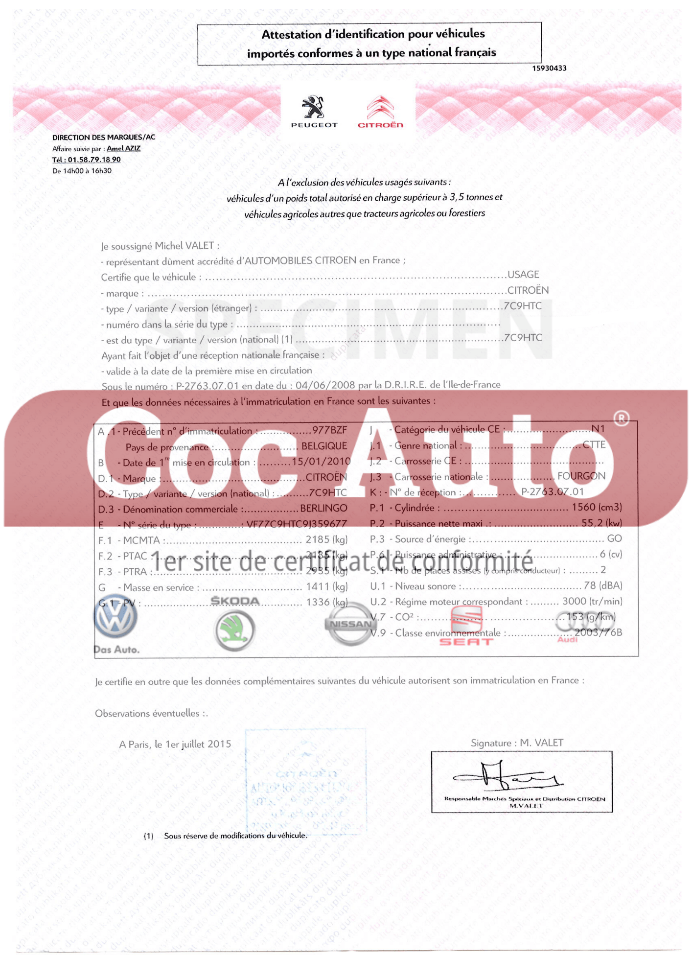 L’attestation Française contient des informations d’ordre national permettant de vérifier si celui-ci est aux normes. Il comprend la taille des pneus, la source d’énergie, la puissance fiscale, le nombre de siège, le CNIT…