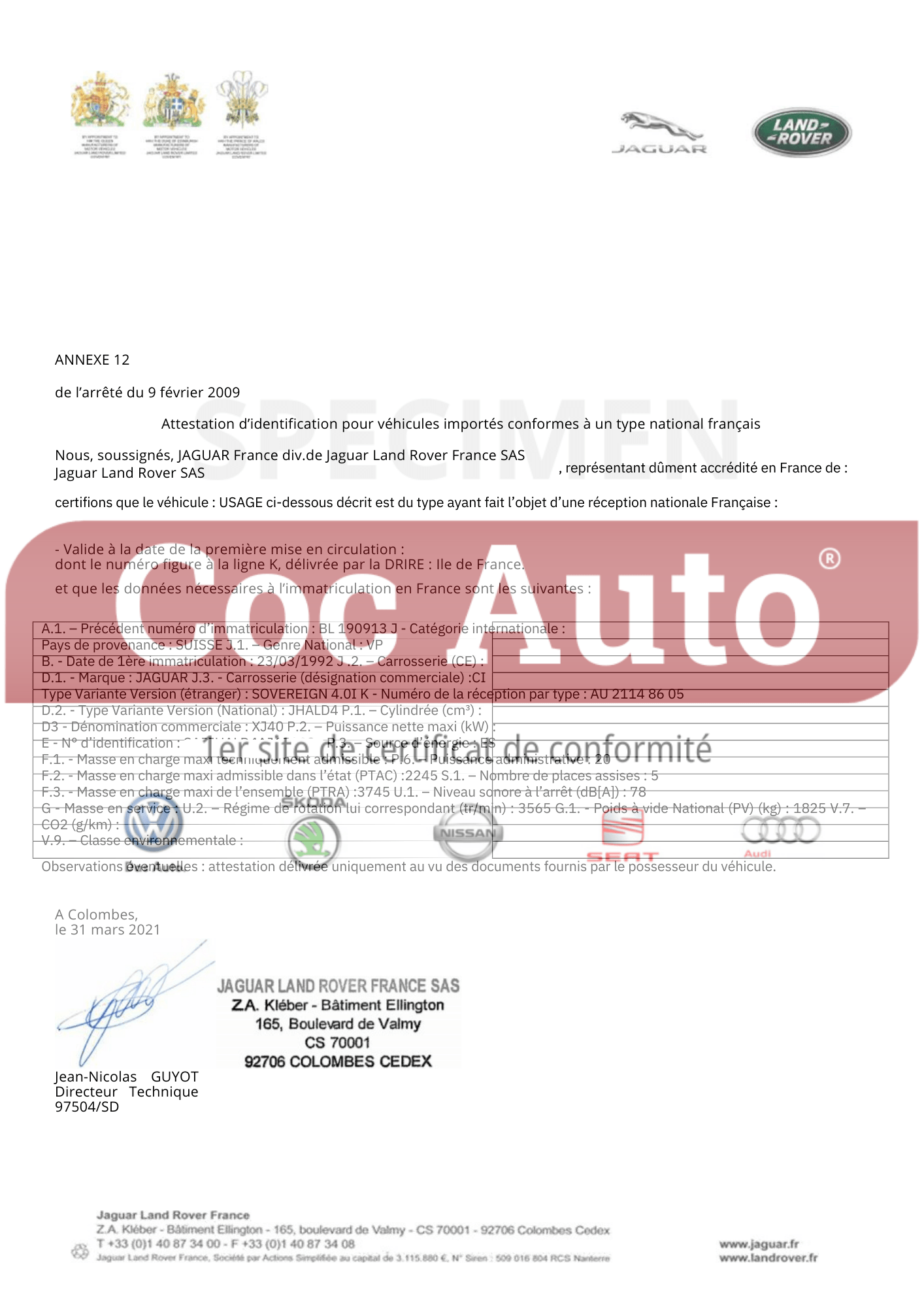 (Attestation d’homologation Jaguar)