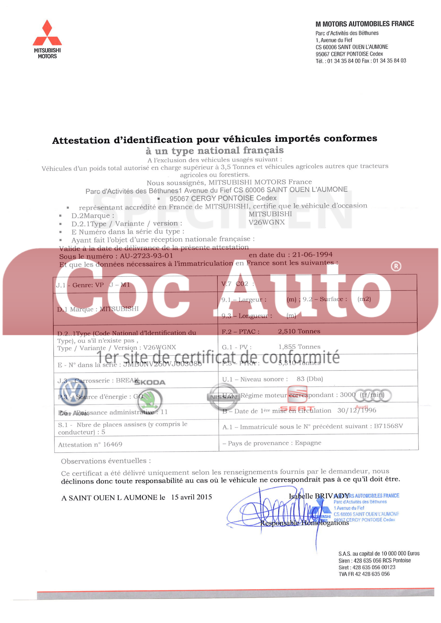 Attestation d’identification Française Mitsubishi