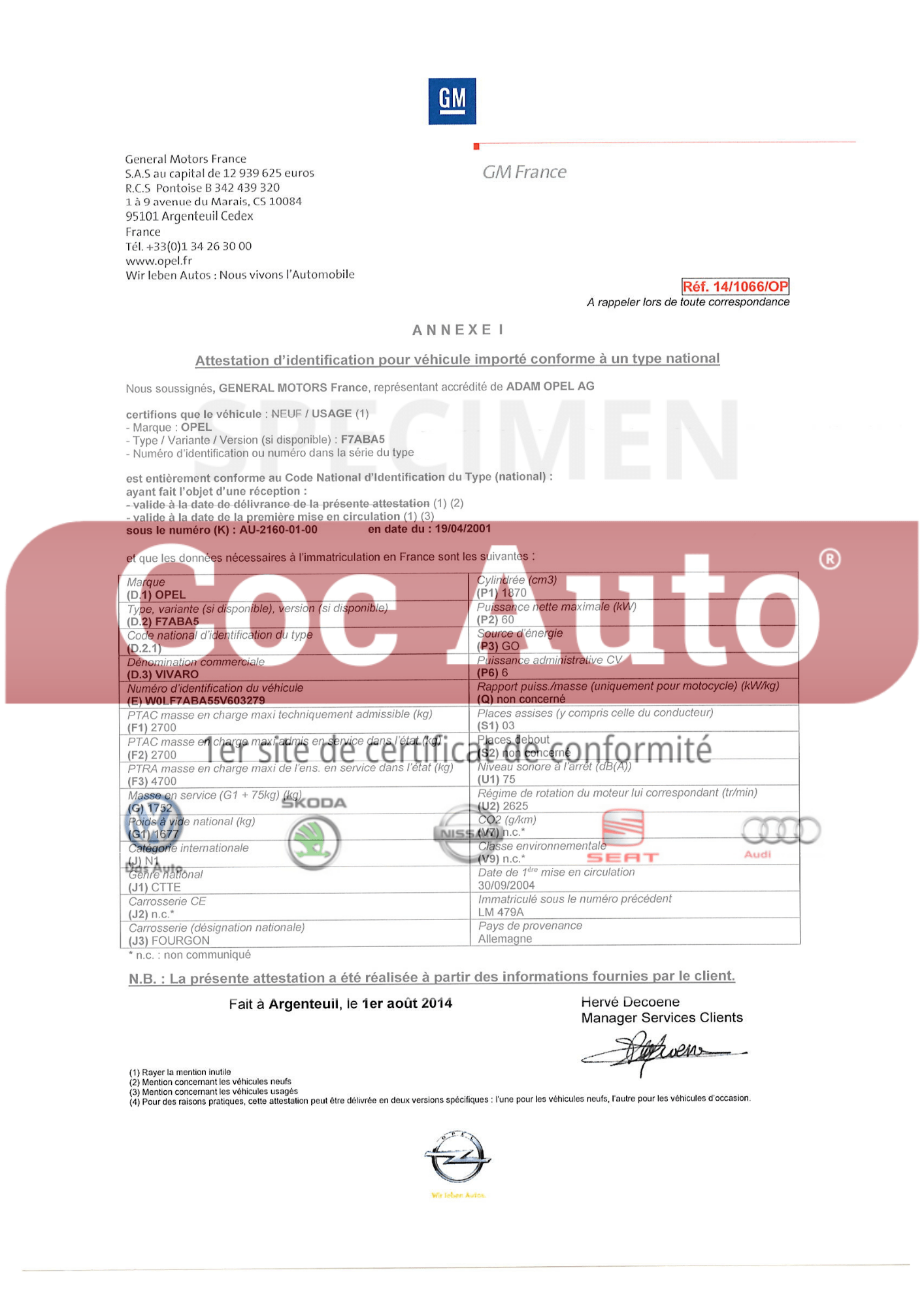 (Attestation d’homologation Opel)