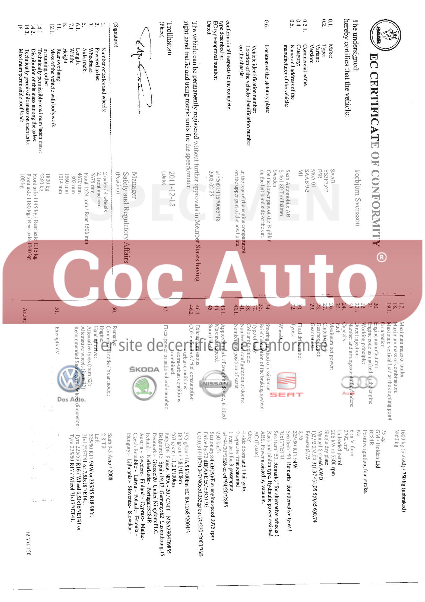 (Attestation d’homologation Saab)
