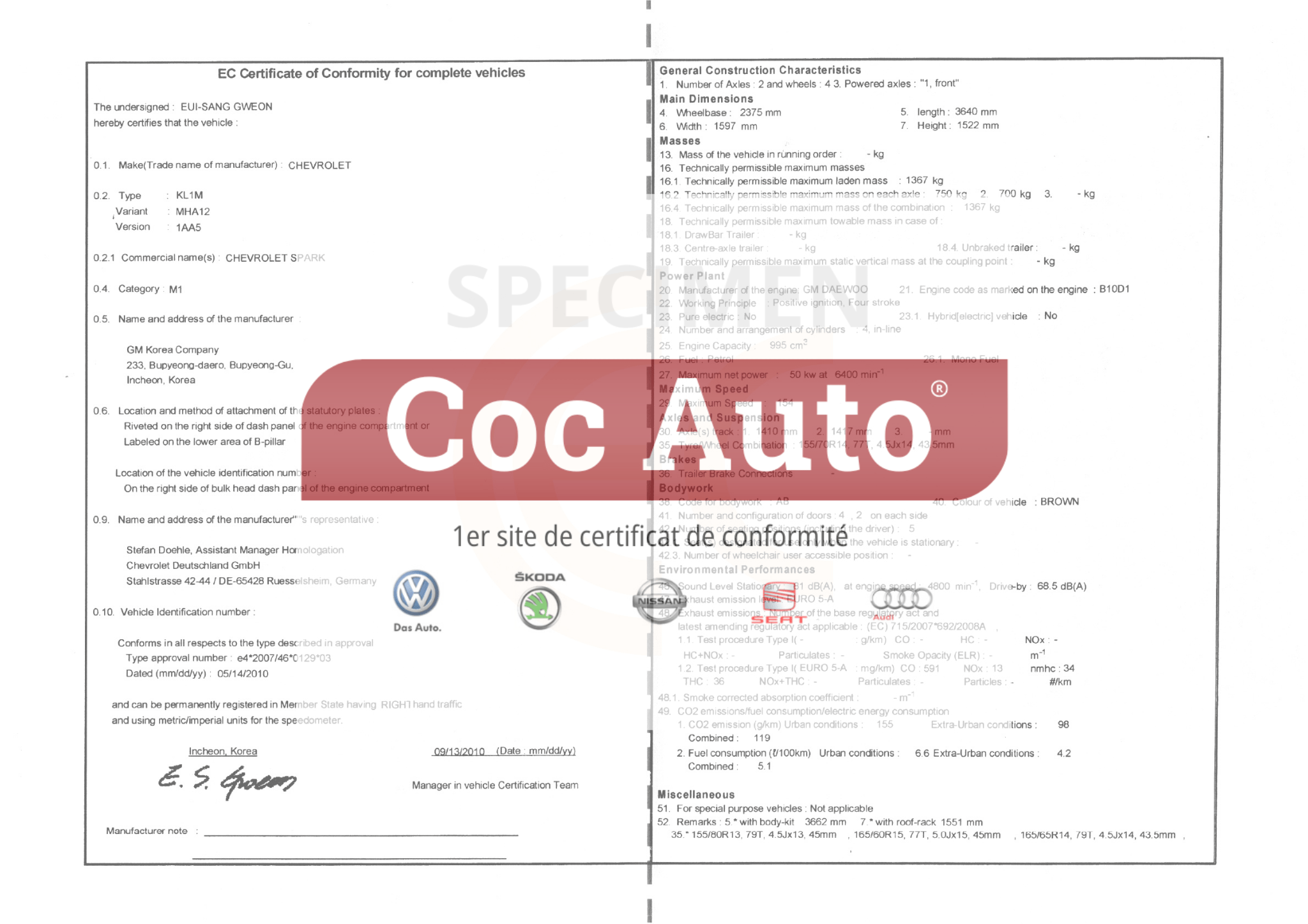 Certificat de conformité Chevrolet (COC Chevrolet)