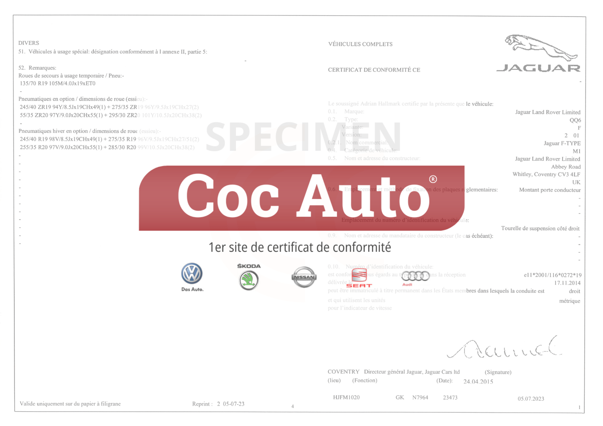 Certificat de conformité Jaguar (COC Jaguar)
