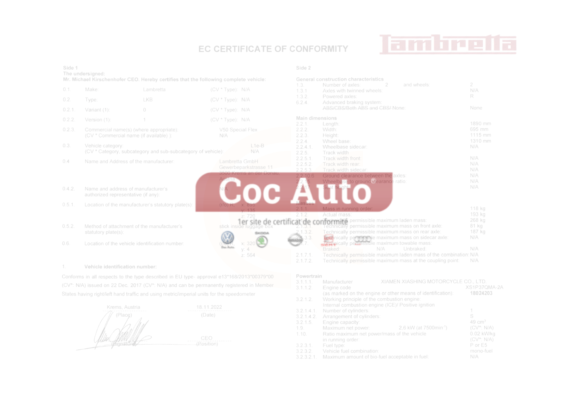 Cocauto, l’agence française numéro 1 en France et en Europe vous fournit le certificat de conformité officiel obligatoire pour l’ANTS et les préfectures européennes pour vos démarches d’obtention du certificat d’immatriculation.
