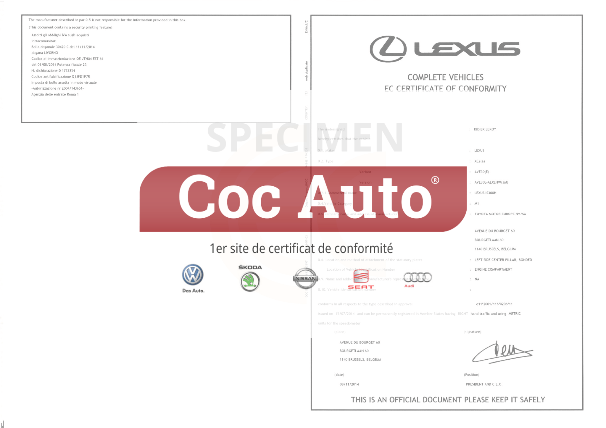 Le certificat de conformité européen appelé également COC est un document obligatoire pour immatriculer un véhicule dans tout pays européen en provenance d’un pays européen pour un autre pays européen.