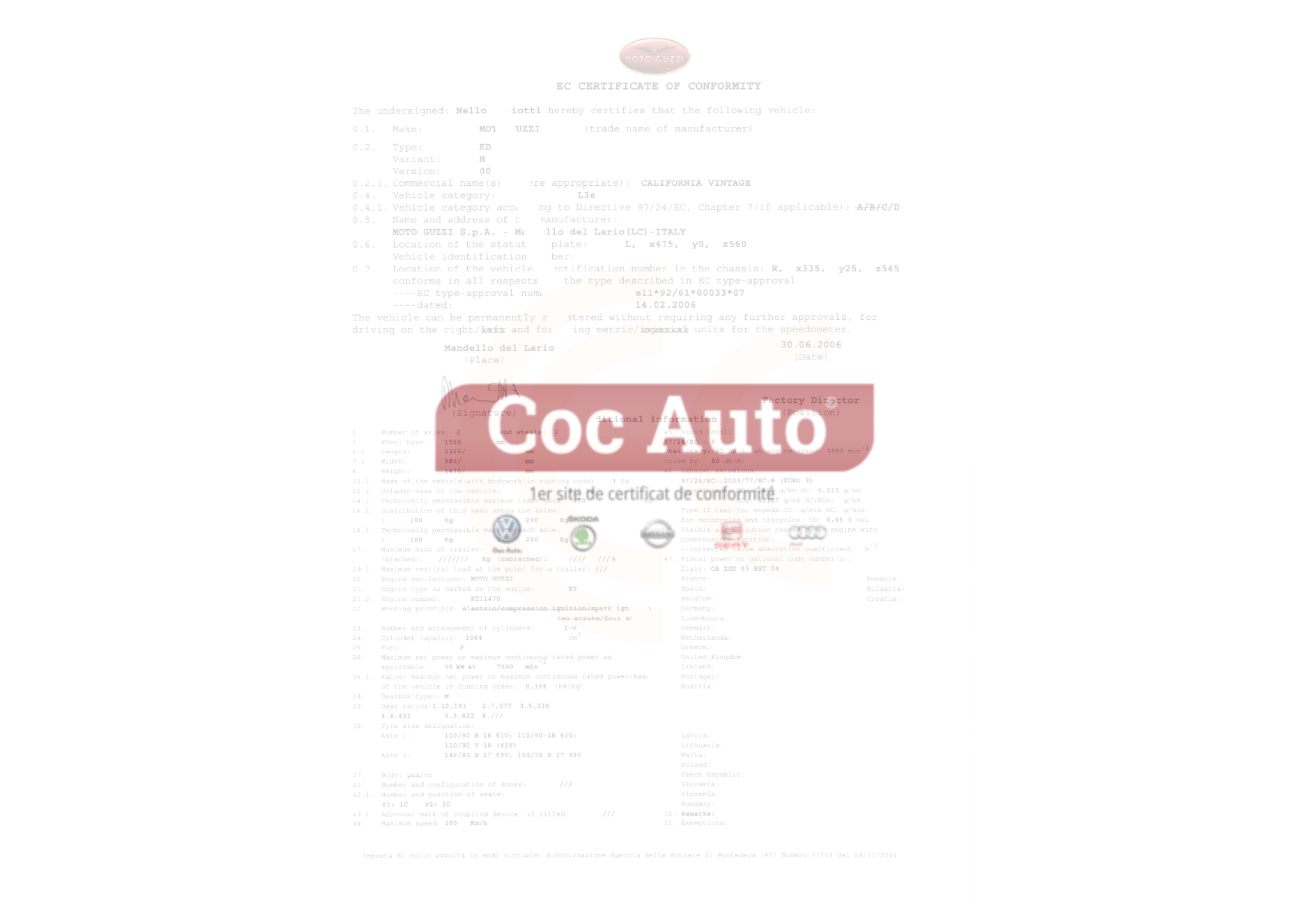 Certificat de conformité Moto Guzzi