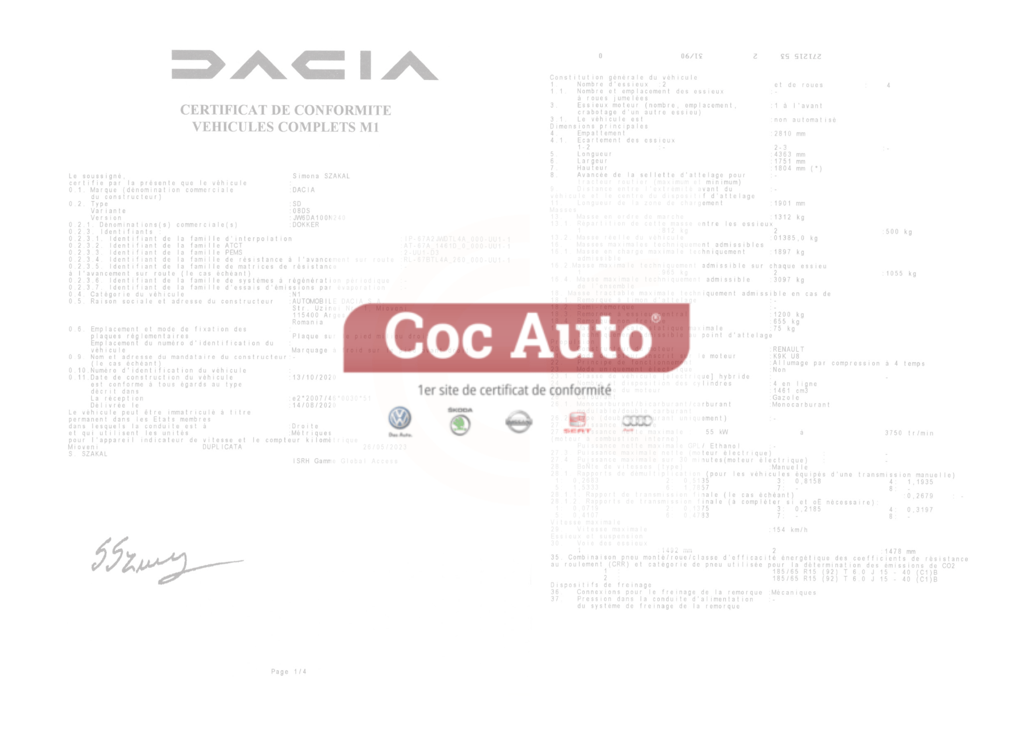 Certificat de conformité utilitaire Dacia