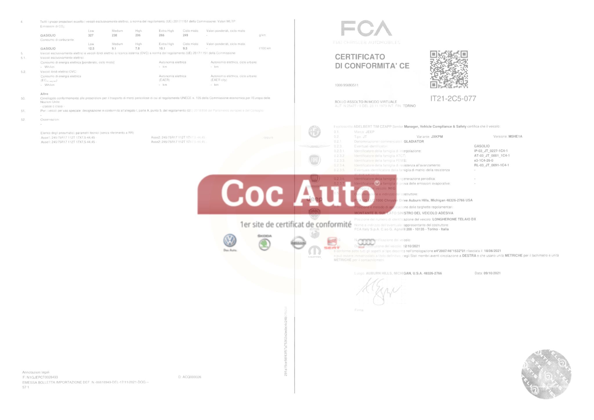 Certificat de conformité utilitaire Jeep