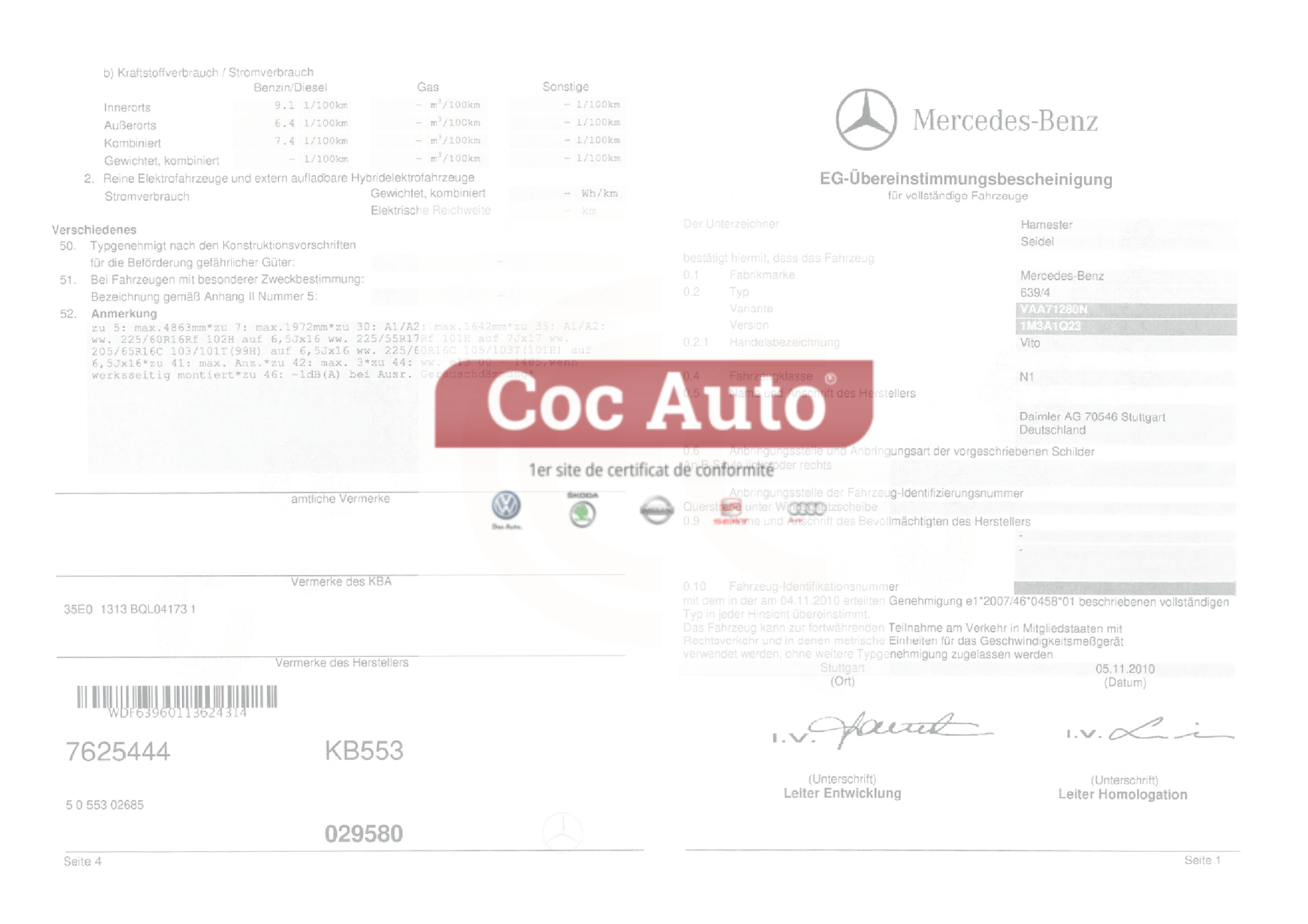 Certificat de conformité utilitaire Mercedes
