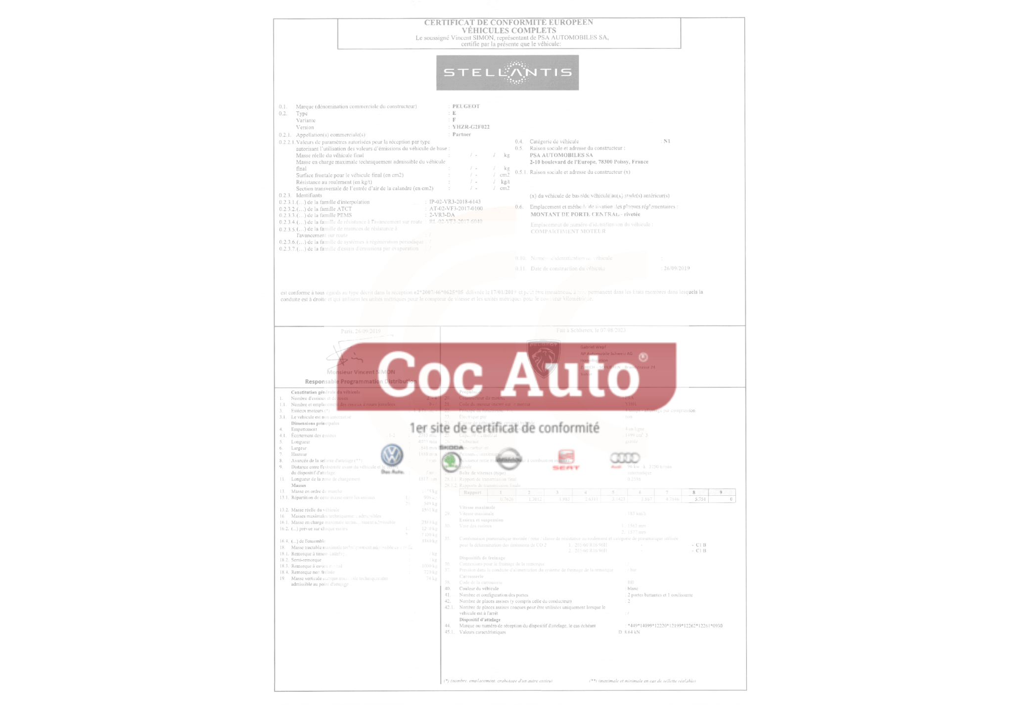 Certificat de conformité utilitaire Peugeot