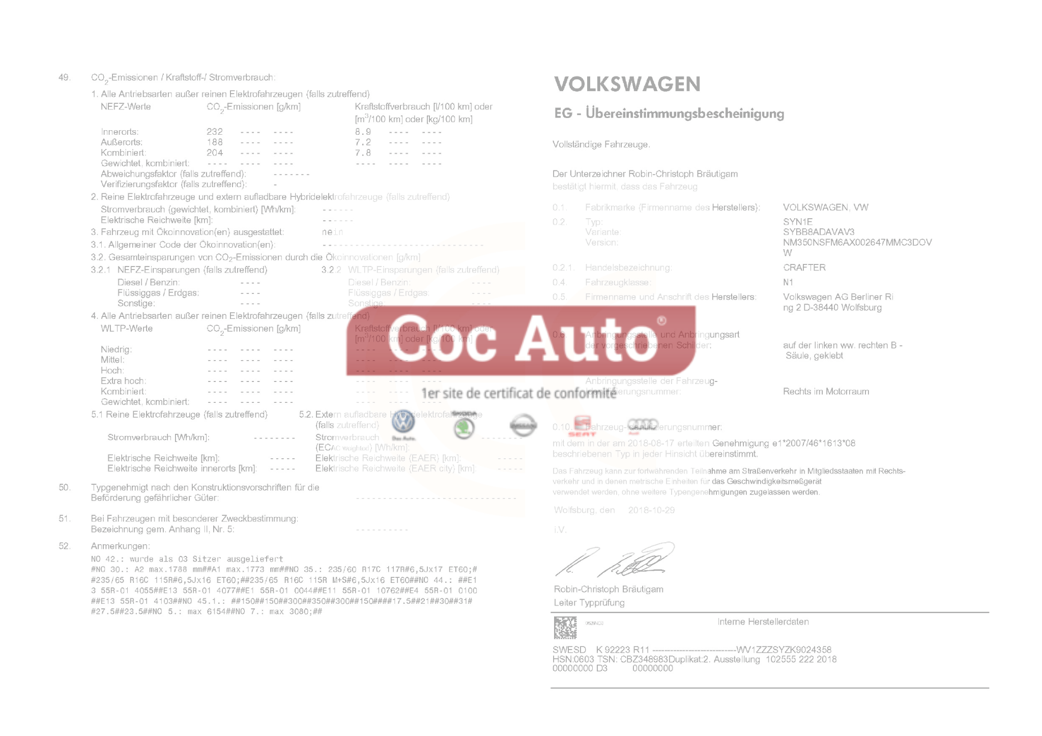 Certificat de conformité utilitaire Volkswagen